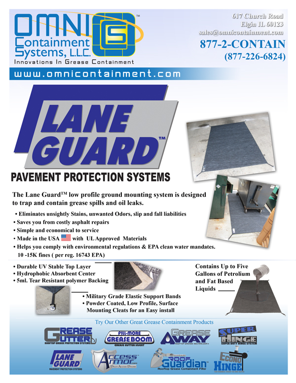 The Lane Guard low profile ground mounting system is designed to trap and contain grease spills and oil leaks that would otherwise stain and damage dumpster corral surfaces or drive-thru lanes.